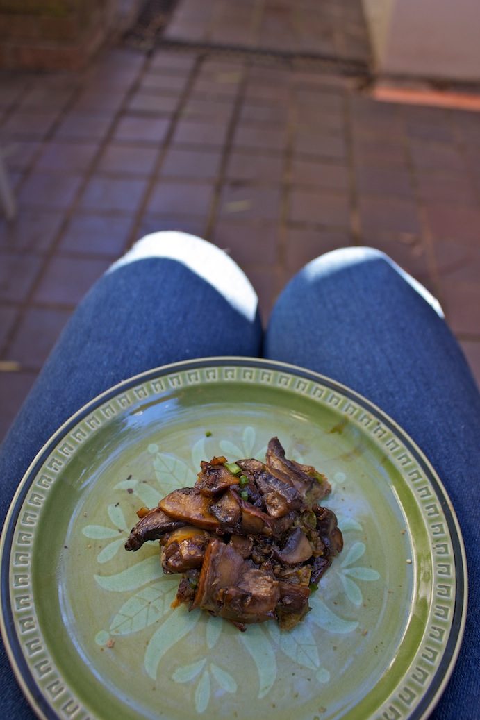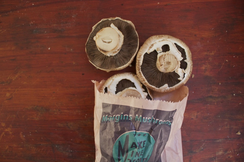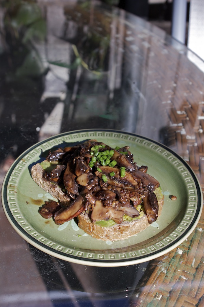 I got these swiss brown mushrooms at the Eveleigh Farmers Market one Saturday with Sarah and Mum. The ‘shroom salesman was very chatty, showing us pictures of the mushrooms being grown and also one of his wife, “The Mushroom Queen of Woy Woy”. We also picked up some goat’s curd, a few phenomenal Billy Kwong pork buns, bunches of kale, purple carrots and beetroot and a huge slab of beef rump (which served as the innuendo portion of the trip). We hung out and ate amazing market purchases all weekend, but when my family finally cleared out, the fridge was still chock full of food. I didn’t want to waste these mushrooms on something where they would only be an accompaniment, so mushrooms on toast it was!