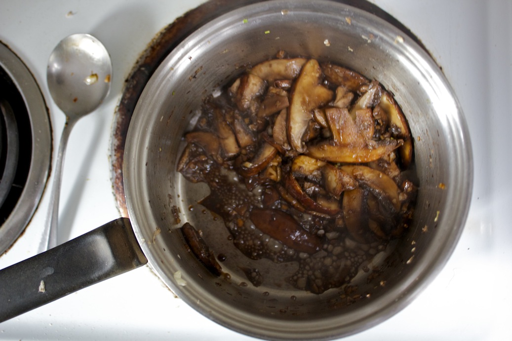 Saute mushrooms, garlic and ginger for ten minutes on medium heat until softened on the outside. Add liquid ingredients and let reduce for five minutes. Serve on some really freaking rustic toast.